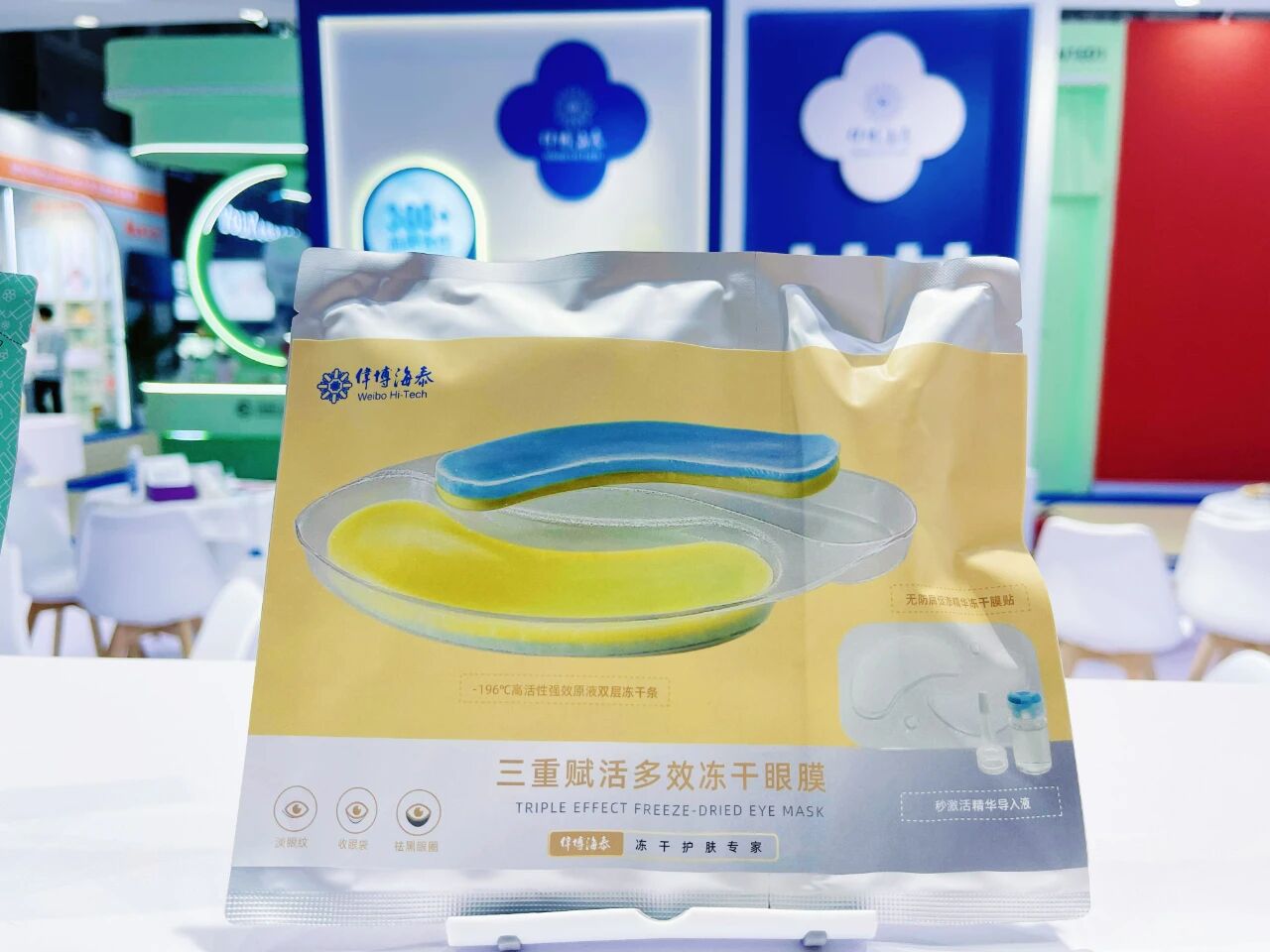 伟博海泰全新三重赋活多效冻干眼膜惊艳亮相展会,吸引众多客户体验咨询。产品依托核心isol冻干赋型技术,在-196°C的超低温环境中,锁存活性成分,使活性最大化。产品创新采用“冻干膜贴+双层冻干条+精华液”的组合设计,膜贴、冻干条与精华液中均搭载不同功效活性成分,使用时,将精华液浸润冻干膜贴后覆盖于冻干条之上,三者中的活性成分即刻协同起效。产品集淡化眼纹、收紧眼袋、祛除黑眼圈三大核心功效于一体,通过精妙的配方设计与剂型创新,实现1+1+1>3的叠加护肤效果,为眼部肌肤带来全方位的凝润焕新体验。